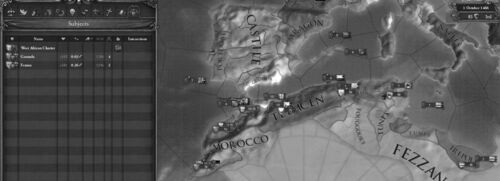 グラナダ国境にカスティリャ軍が集まってきたので、仕方なくカスティリャを誘って仮想敵国 rival チュニスを懲らしめるだけの戦争を開始。この大義名分では領土は貰えないが、属国化は普通に可能だった。 全く気づいてなかったぞ今まで。グラナダ攻略、全然…